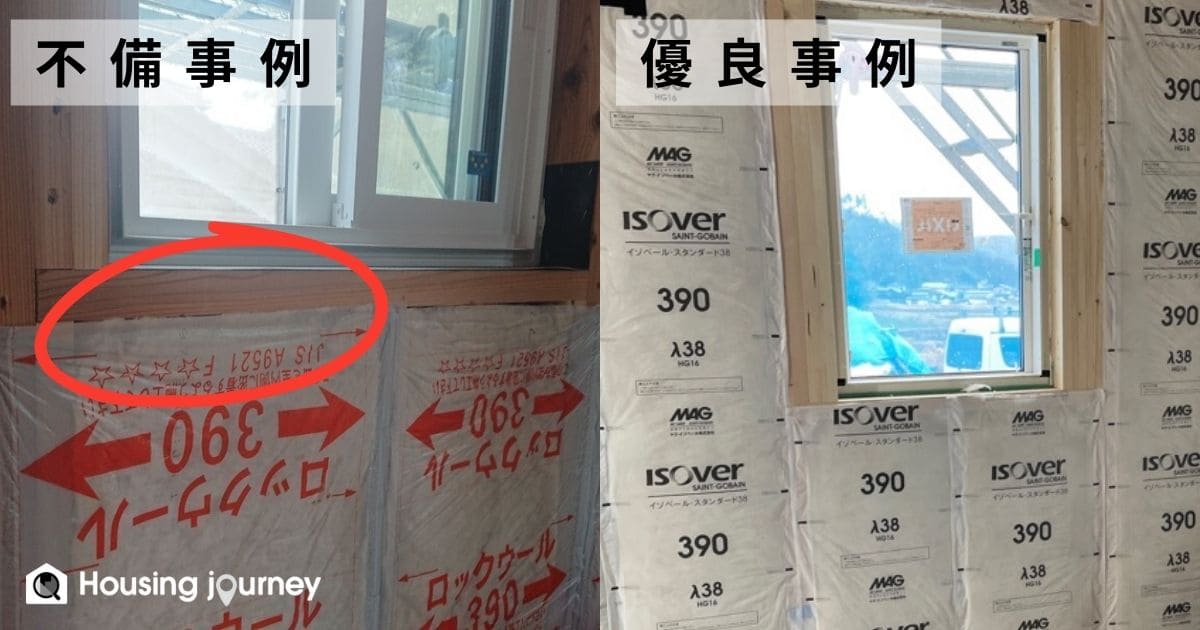 まず見つけやすい不備のひとつが、断熱の隙間です。写真で比較してもらうと分かりやすいでしょう。1枚目の写真を見ると、窓枠の下に断熱材の隙間があり、中身が見えてしまっています。隙間がある状態では、本来の断熱材の性能を十分に発揮できません。そのため、中身が見えないように防湿フィルムで覆うか、テープで留めて隙間をなくす必要があります。