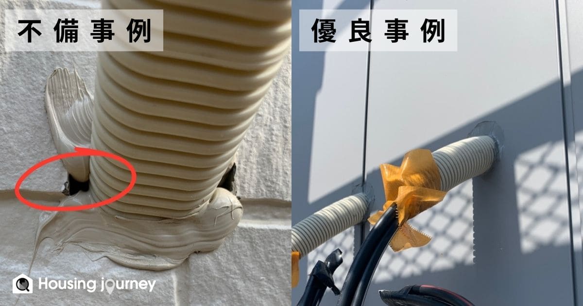 外装完成時にまず確認しておきたいのは、設備貫通部のコーキング処理です。例えばエアコン用の配管部分。コーキング処理が甘いと、雨漏りや虫の侵入の原因になってしまいます。エアコンは別業者が施工することも多く、雨漏りへの意識が薄い場合があるため、こうした不備が起きやすいのです。施工するうえで隙間はつきものですが、必ず埋めることが重要です。
