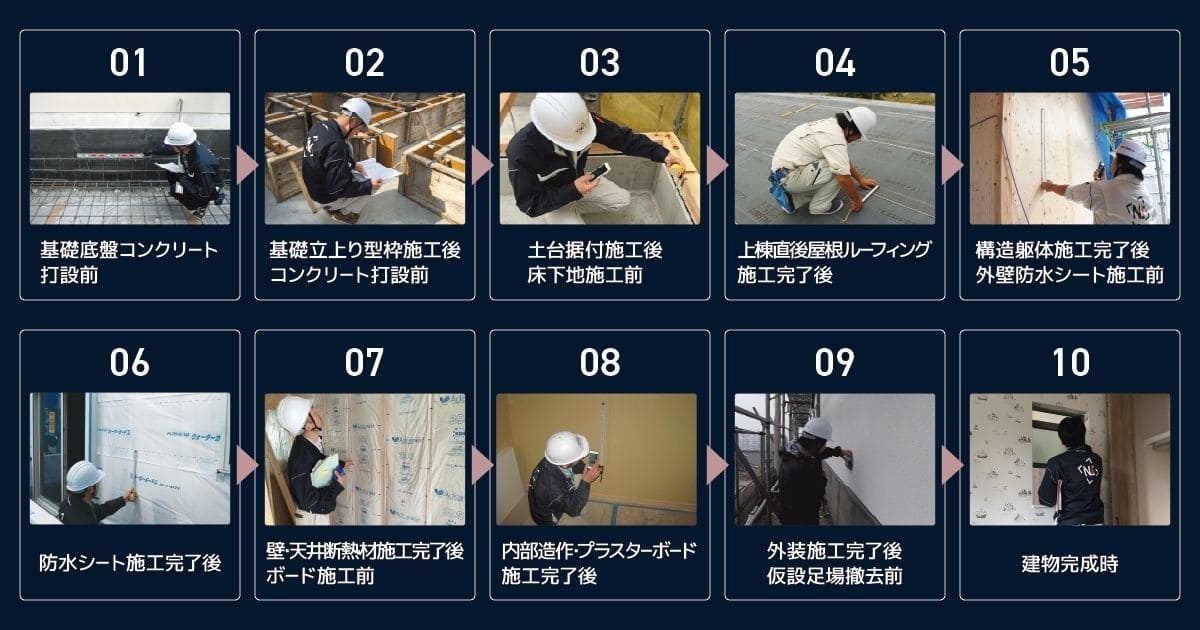 ではここからは、実際に私たちネクストステージが建築中の住宅の「第三者監査」を行う10回の工程で、それぞれどんな不備が見つかりやすいのかを見ていきましょう。少し専門的な内容も出てきますので、「ここ、よくわからないな」というところがあれば、お気軽にお施主さま窓口で相談ください。山下をはじめネクストステージ技術メンバーでしっかり回答をさせていただきます。