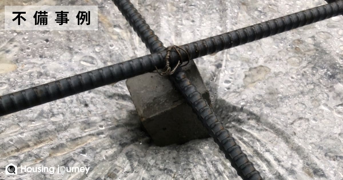 ひとつ目は「スラブ筋スペーサーブロックの沈込みの不備」です。べた基礎では、地面と鉄筋との距離(=かぶり厚さ)を確保するために、「スペーサーブロック」という部材を使用します。ところがこの不備では、そのブロック自体が沈み込んでしまっています。鉄筋の重みにすら耐えられず沈み込んでしまうような状況で、このままコンクリートを打設し、その上に家が建っていったらどうなるでしょうか。