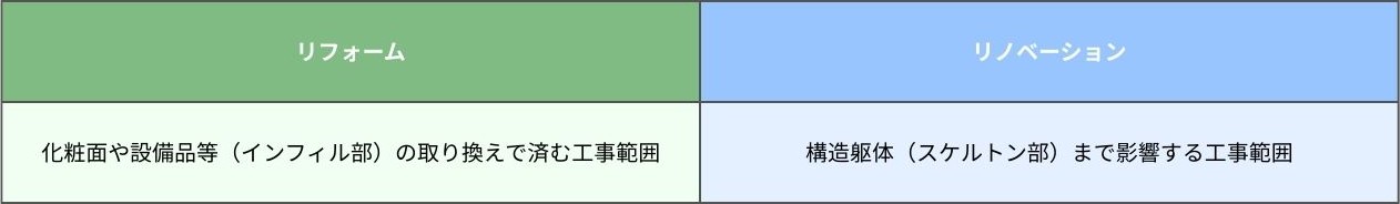 まず、リノベーションとリフォームの違いをご説明したいと思いますが、皆さんにわかりやすく表現すると、構造躯体(スケルトン部)まで影響する工事範囲なのか、それとも化粧面や設備品等(インフィル部)だけの取り換えで済む工事範囲なのかの違いといってもよいでしょう。