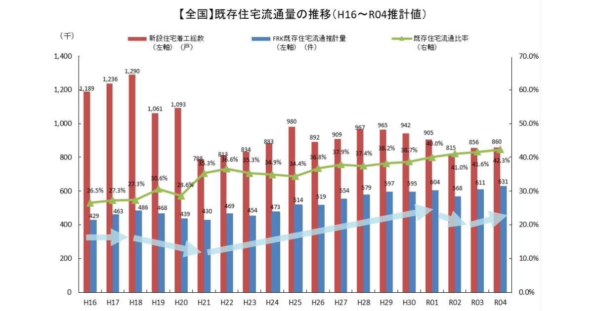 冒頭で触れたとおり、2022年の既存住宅流通比率は42.3%。これは過去最多であり、住宅市場自体が「大量に新築を建てていく時代」から「あるものを活かして住み継ぐ時代」へ、シフトしつつあることを表しています。