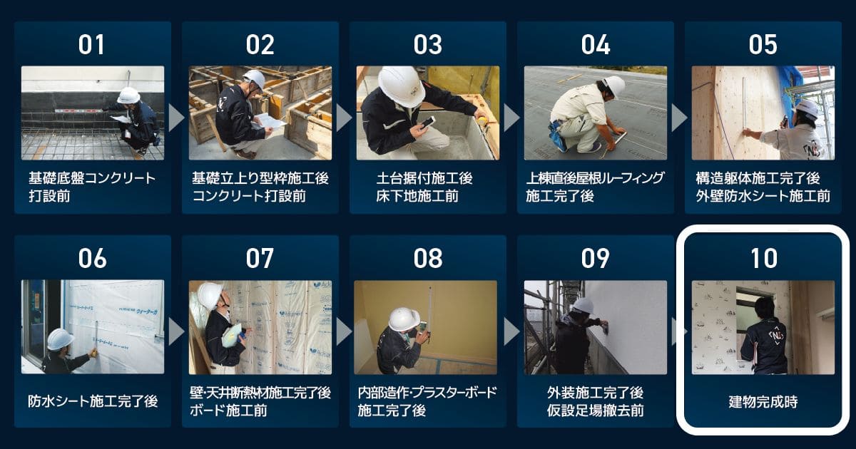 そこで弊社では、住宅の重要な、一度進むと後戻りできない工程を見逃さないために、全10回にわたって第三者の立場から施工状況を確認・評価。住宅品質を確実に守るためのサポートを行っています。