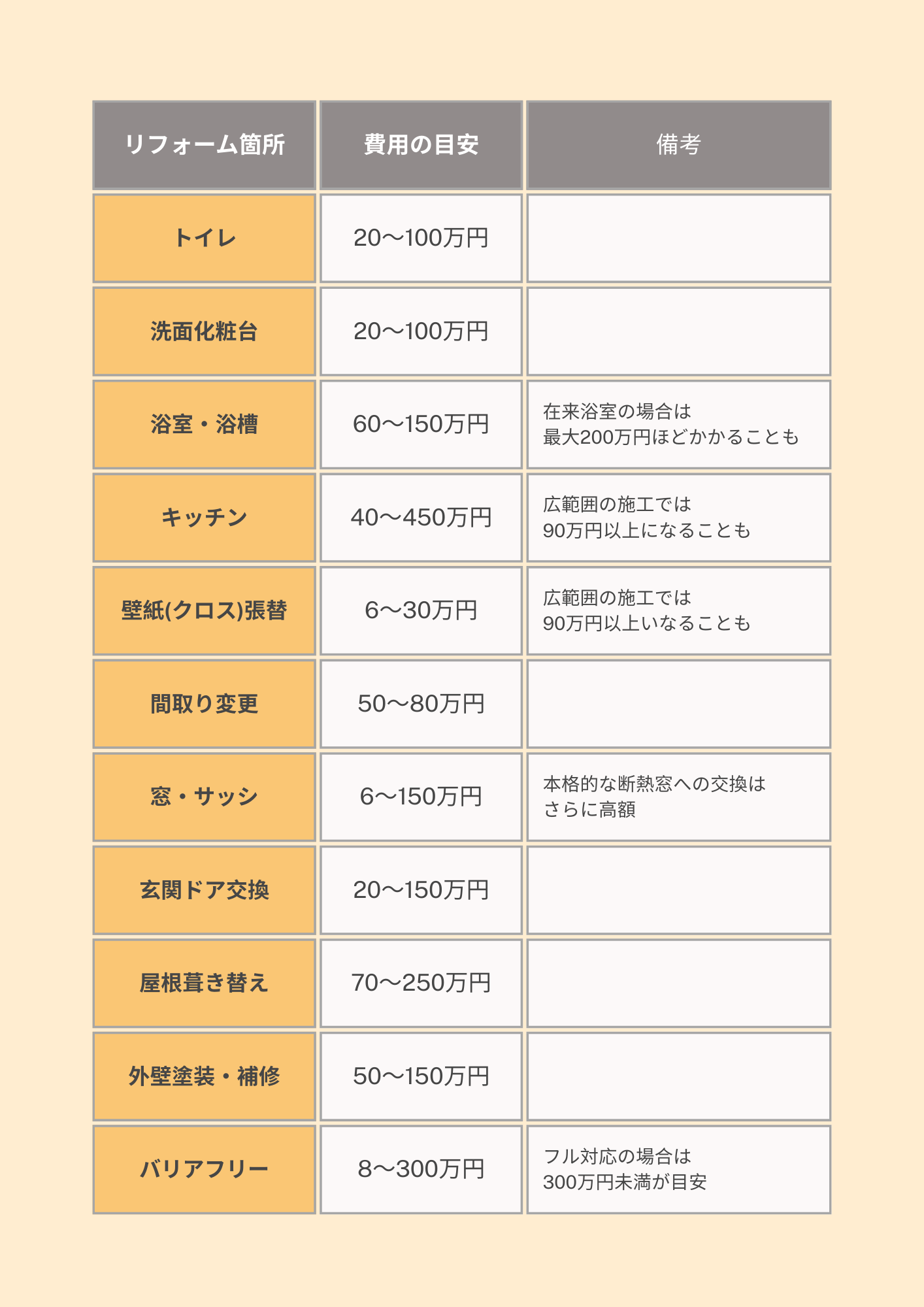 下の表は、国土交通省が公開しているデータをもとに、リフォーム箇所ごとの費用相場をまとめたものです。ご自身の希望と照らし合わせながら、参考にしてみてください。