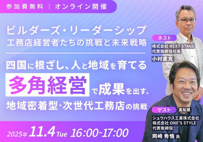 2025.11.4 セミナー開催のお知らせ│ビルダーズ・リーダーシップ ー工務店経営者たちの挑戦と未来戦略ー 株式会社ONE’S STYLE 代表取締役 岡﨑秀悟 氏(高知県)